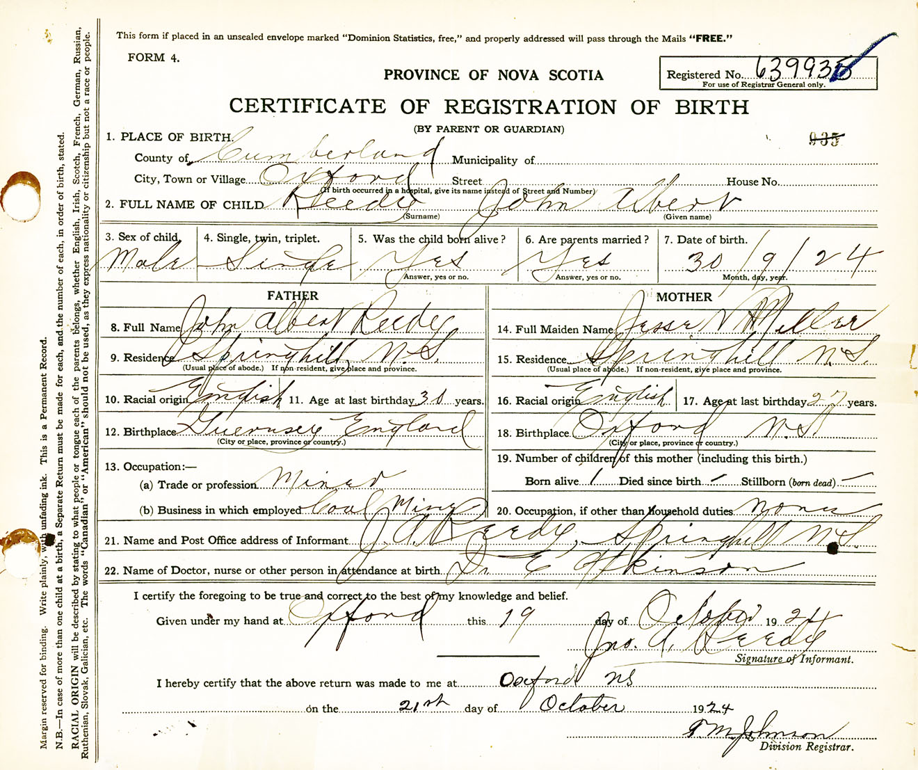 Male Birth Registration: Year: 1924 number: 63900935