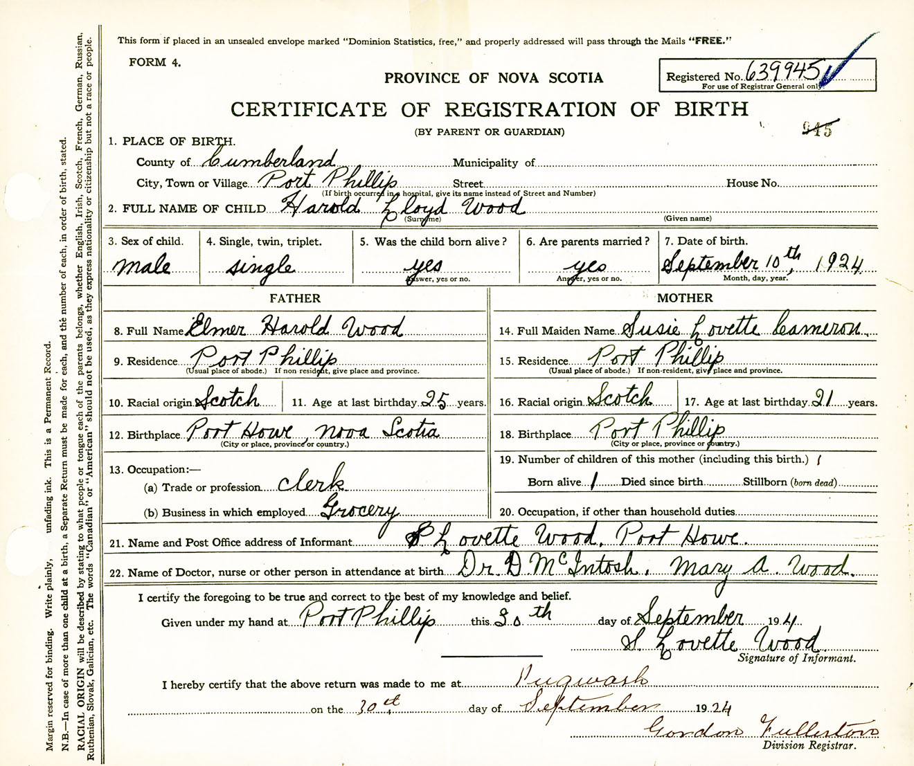 Male Birth Registration: Year: 1924 number: 63900945