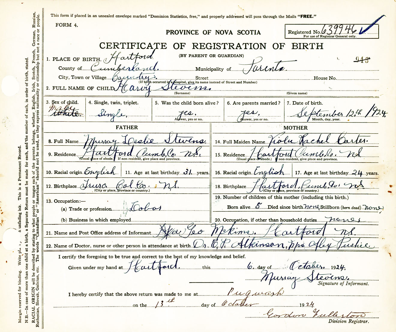 Male Birth Registration: Year: 1924 number: 63900946