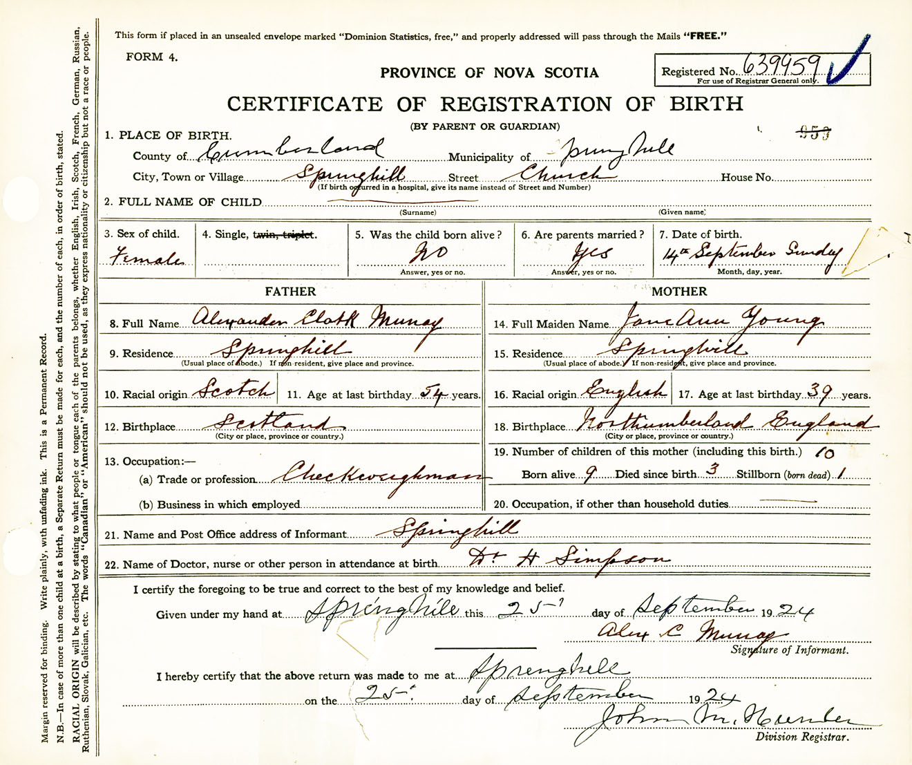 Female Birth Registration: Year: 1924 number: 63900959