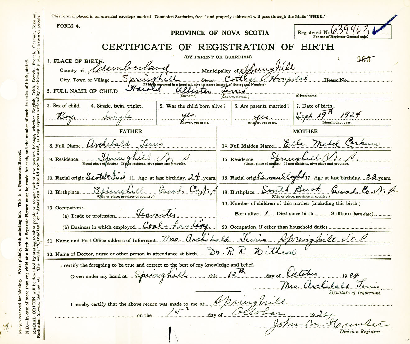 Male Birth Registration: Year: 1924 number: 63900963