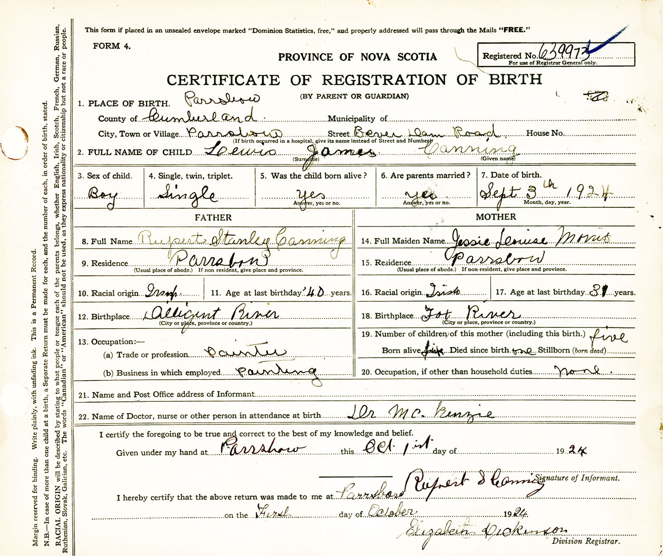 Male Birth Registration: Year: 1924 number: 63900973