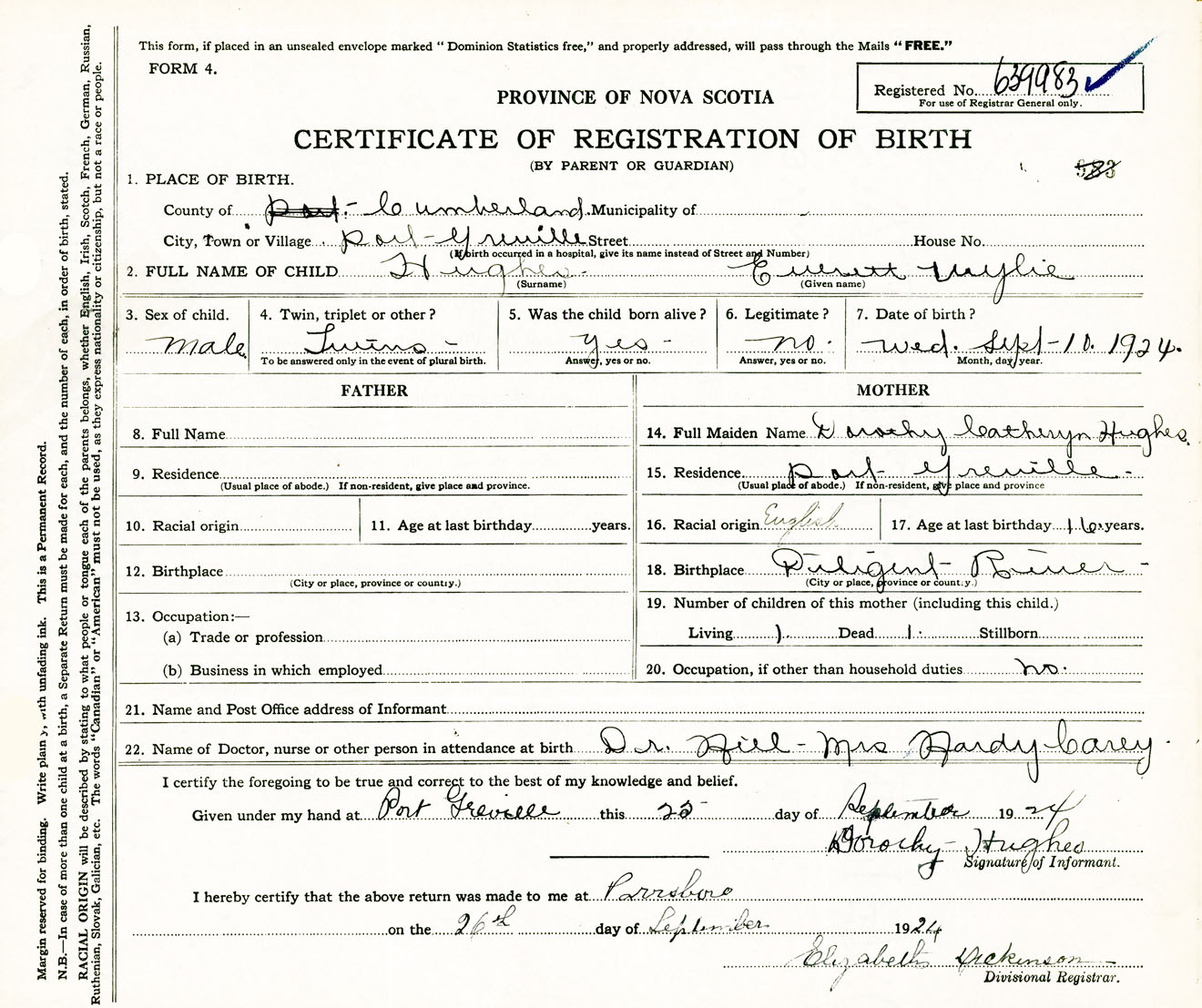 Male Birth Registration: Year: 1924 number: 63900983