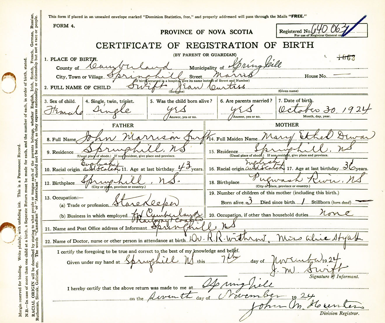 Female Birth Registration: Year: 1924 number: 64000063