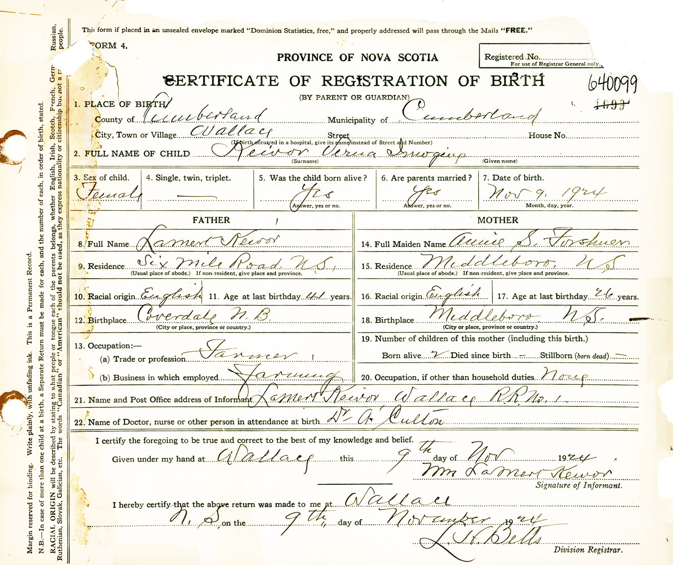 Female Birth Registration: Year: 1924 number: 64000099
