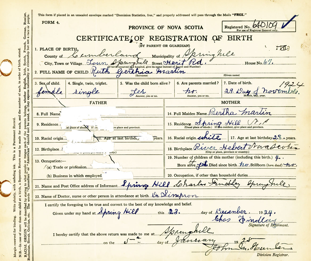 Female Birth Registration: Year: 1924 number: 64000109