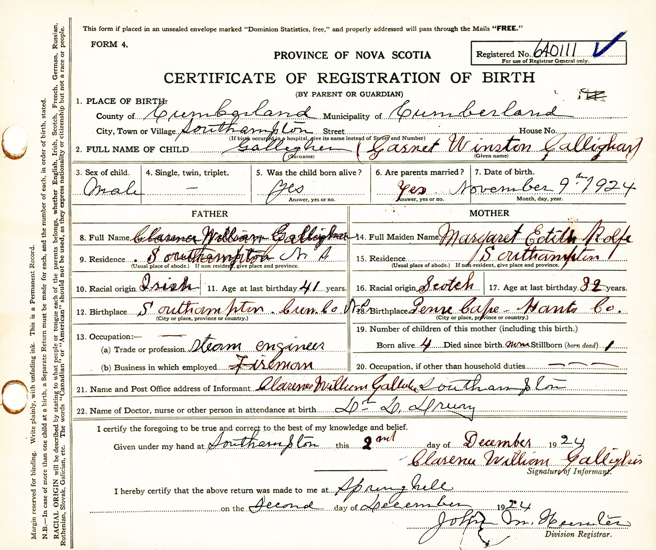 Male Birth Registration: Year: 1924 number: 64000111