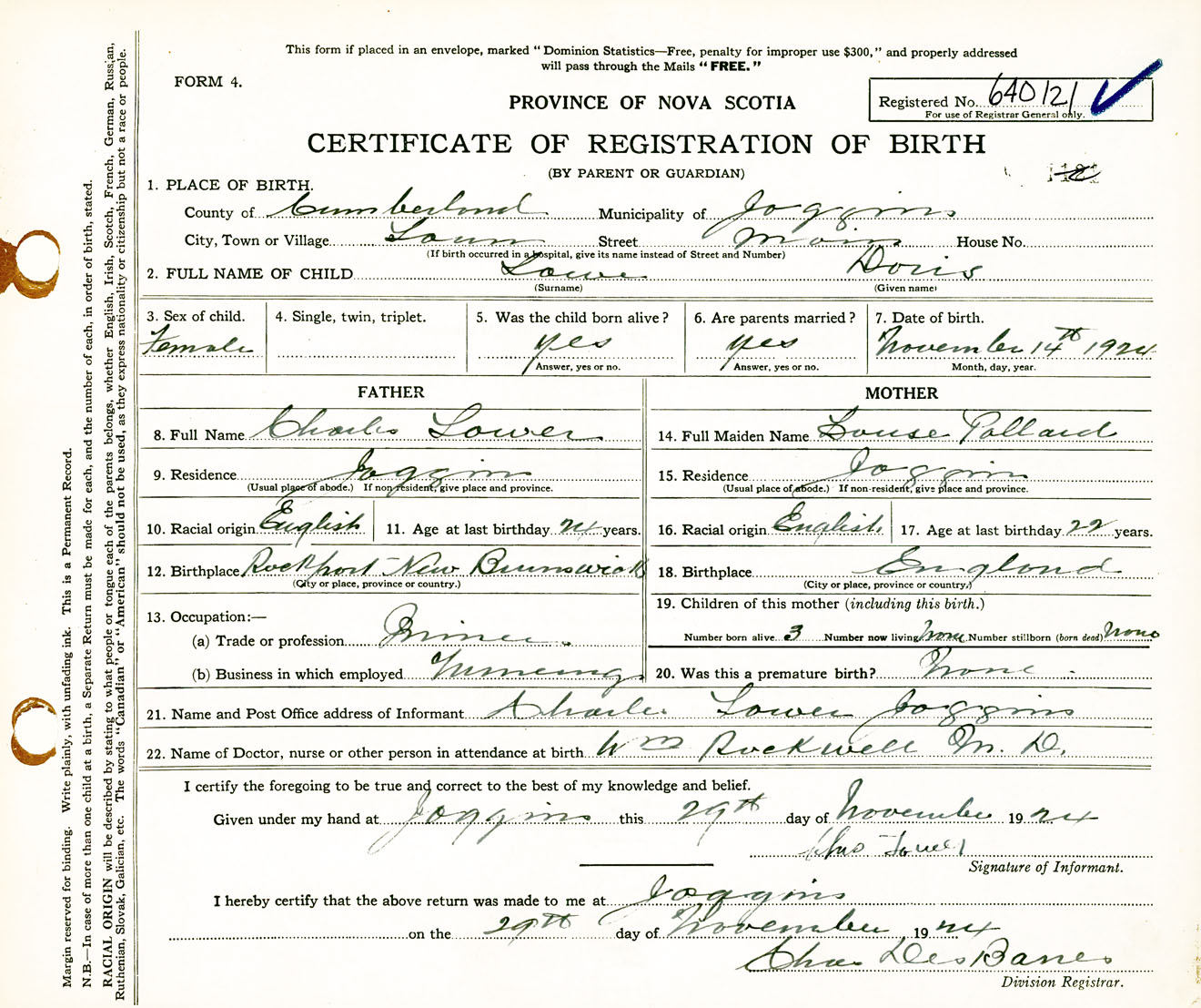 Female Birth Registration: Year: 1924 number: 64000121
