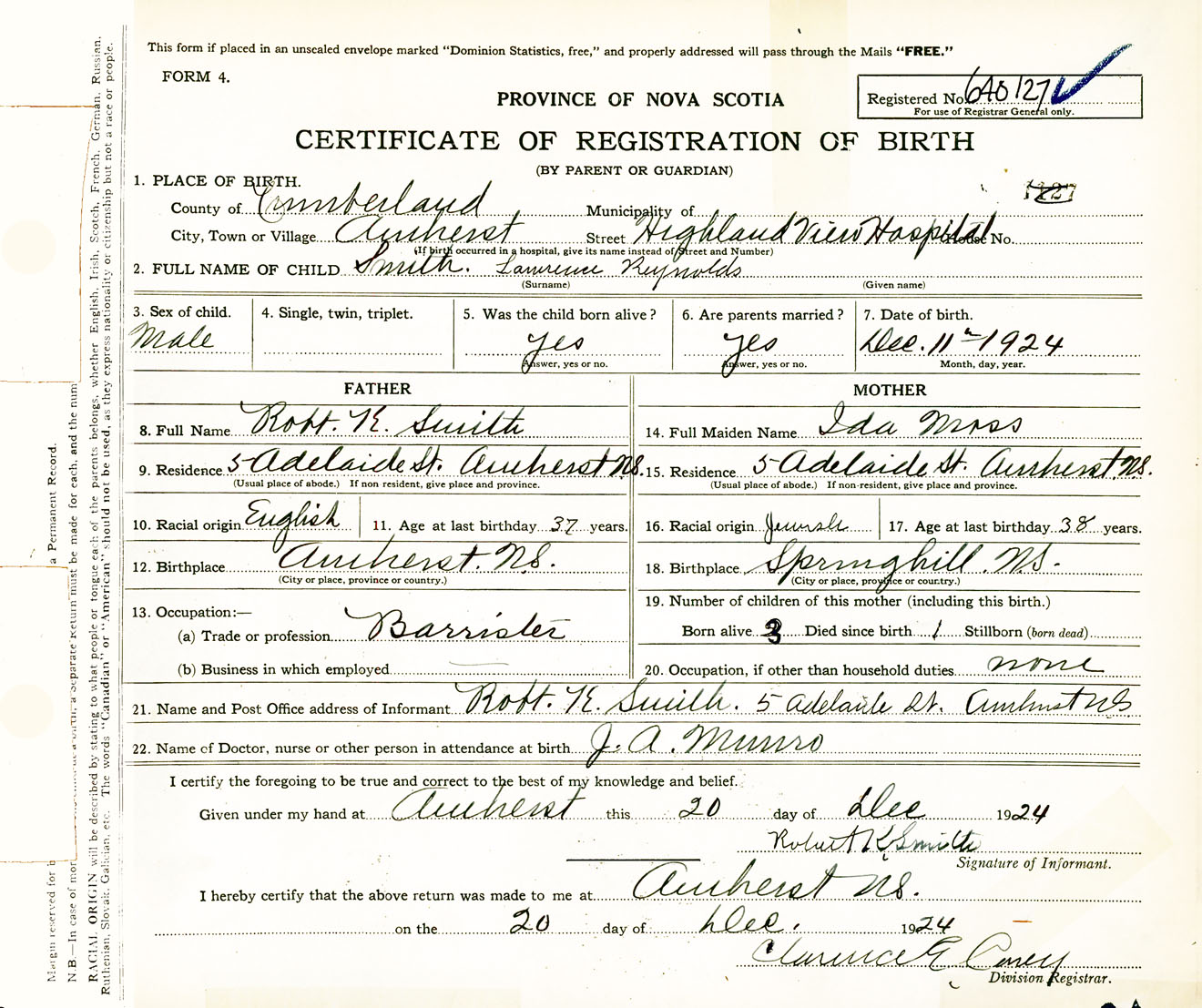 Male Birth Registration: Year: 1924 number: 64000127