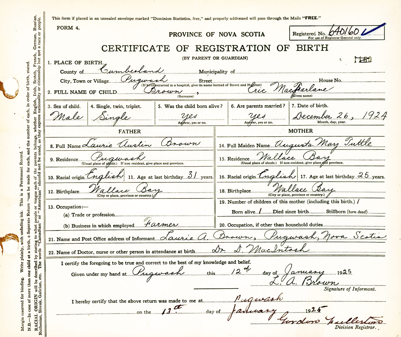 Male Birth Registration: Year: 1924 number: 64000160