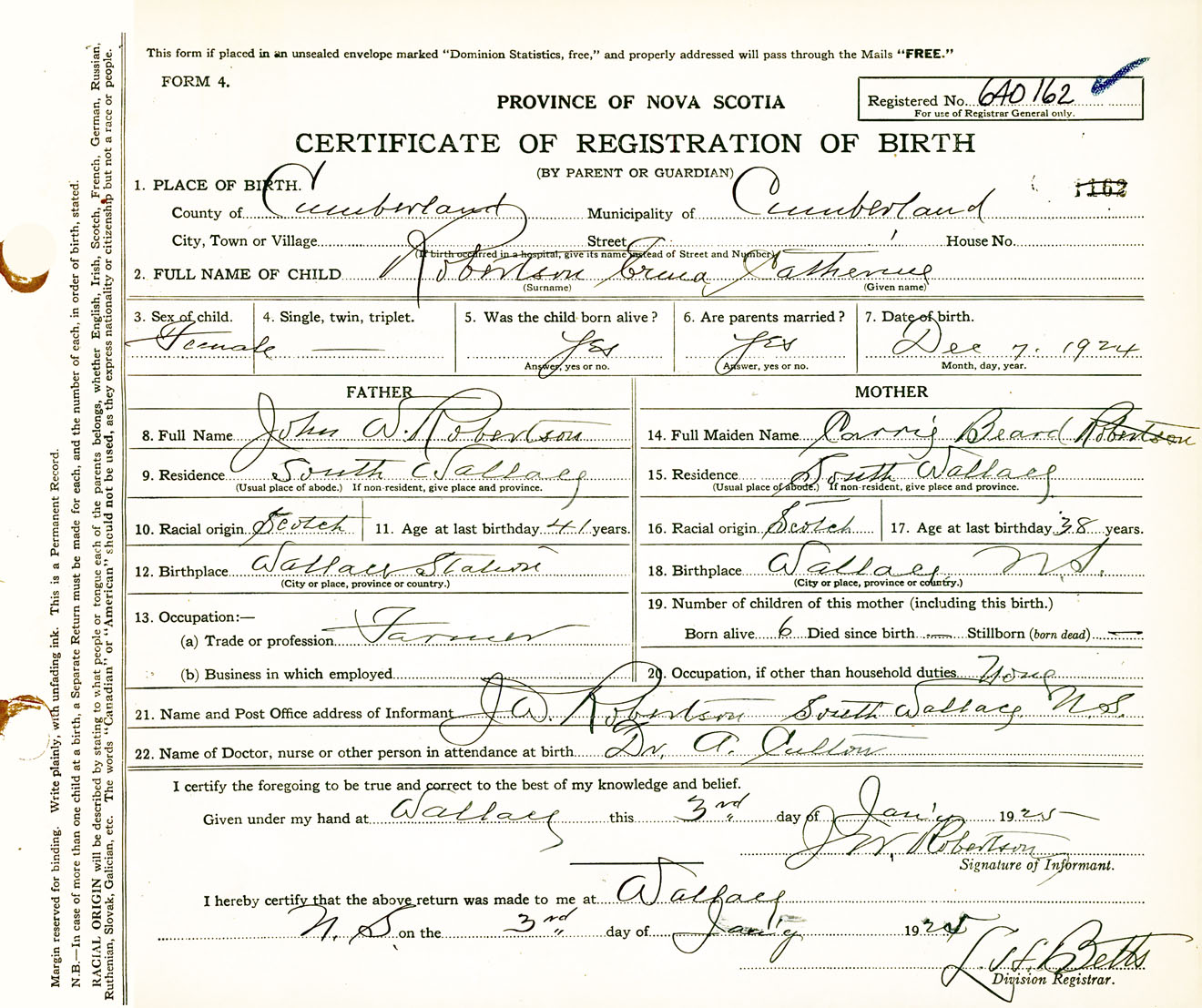 Female Birth Registration: Year: 1924 number: 64000162