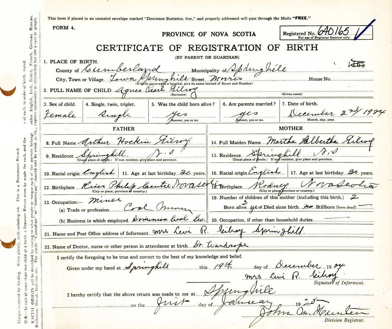 Female Birth Registration: Year: 1924 number: 64000165