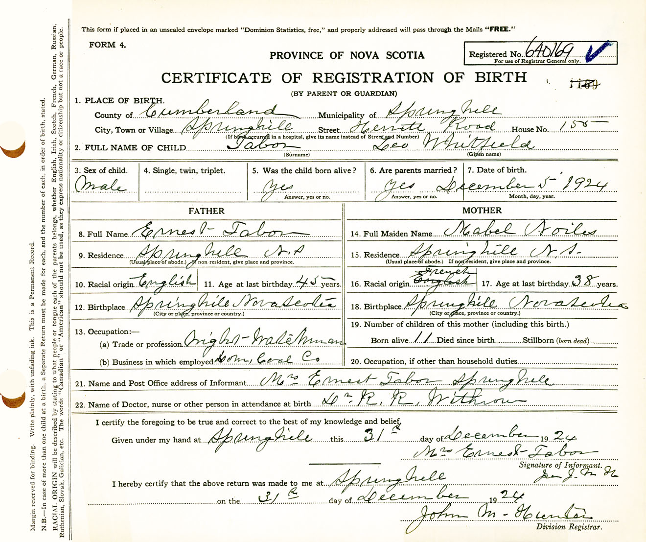 Male Birth Registration: Year: 1924 number: 64000169