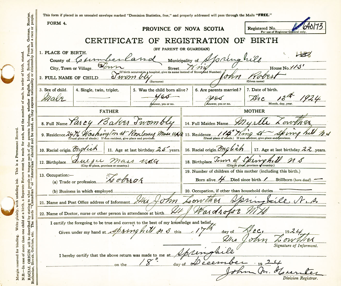 Male Birth Registration: Year: 1924 number: 64000173