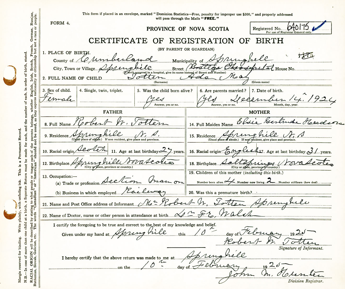 Female Birth Registration: Year: 1924 number: 64000175