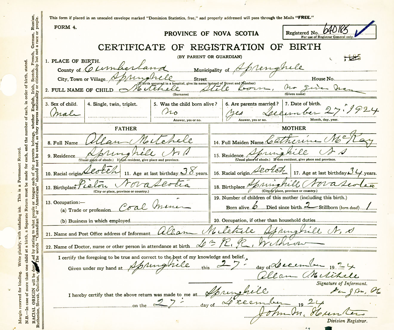 Male Birth Registration: Year: 1924 number: 64000185