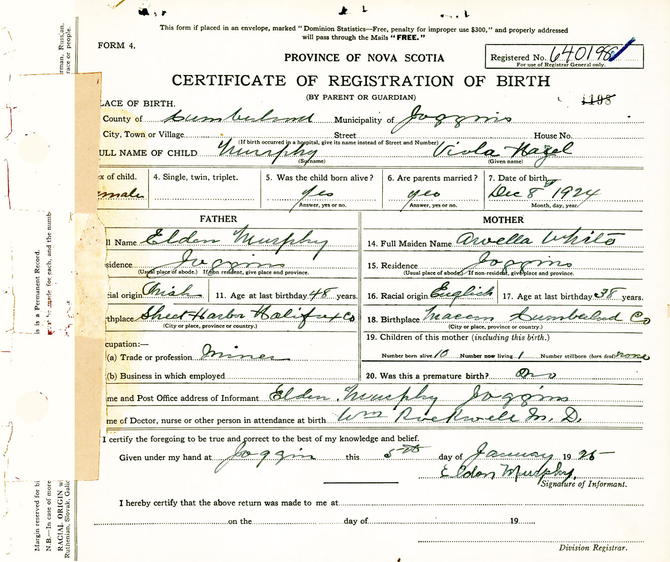 Female Birth Registration: Year: 1924 number: 64000198