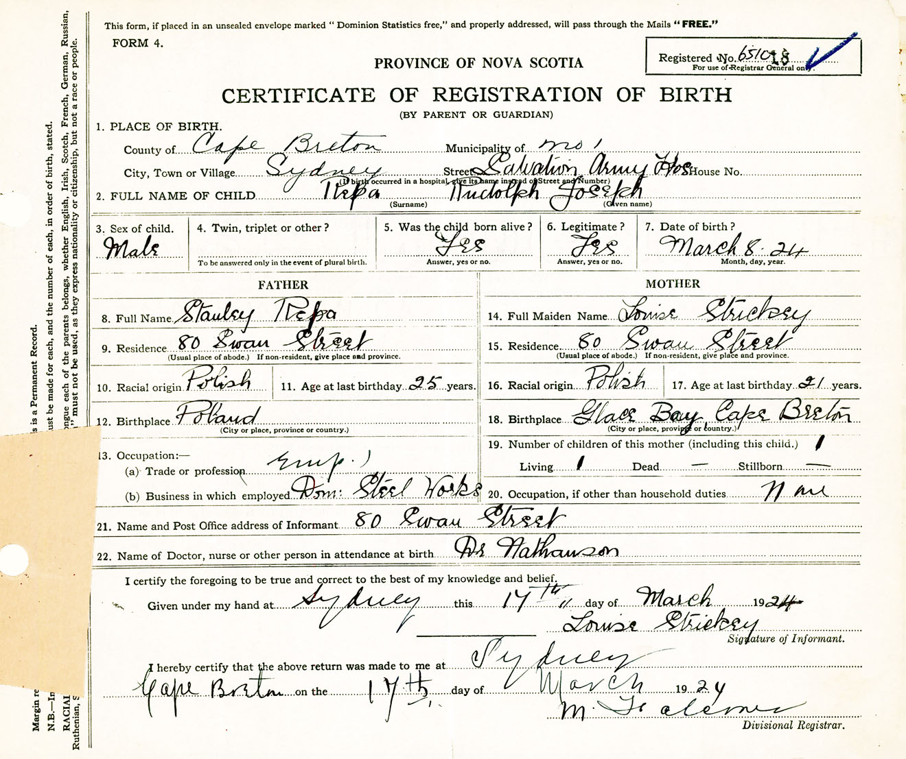 Male Birth Registration: Year: 1924 number: 65100018
