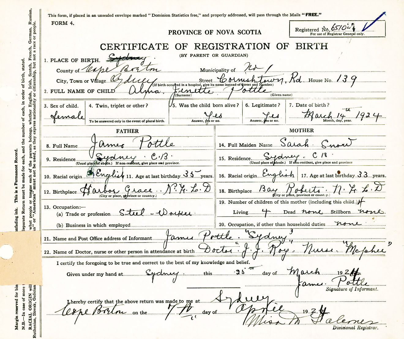Female Birth Registration: Year: 1924 number: 65100021