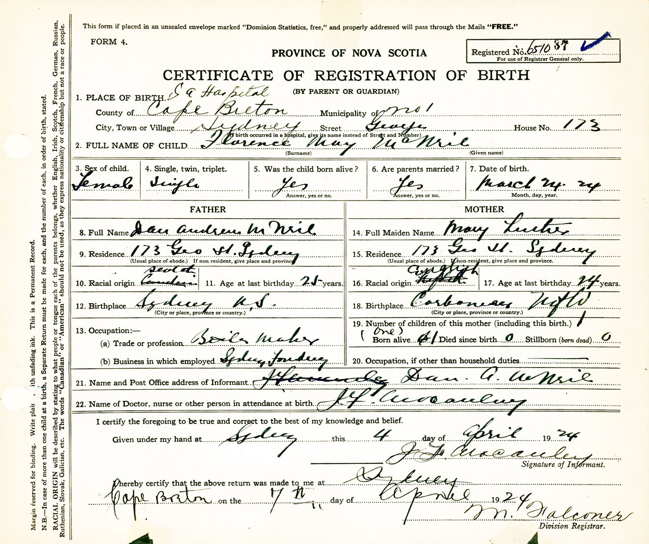 Female Birth Registration: Year: 1924 number: 65100037
