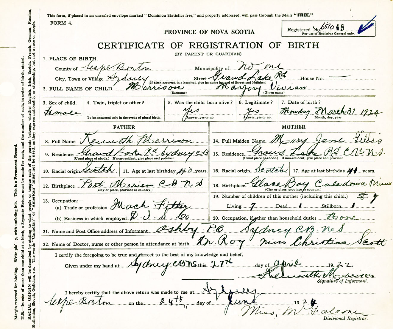 Female Birth Registration: Year: 1924 number: 65100048