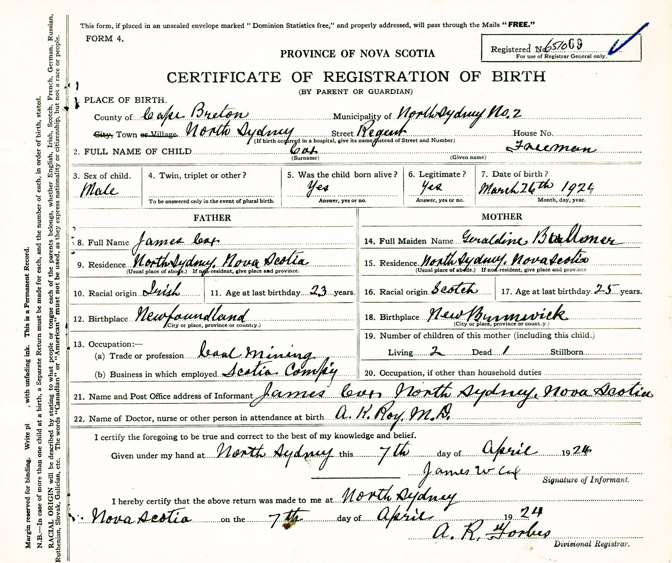 Male Birth Registration: Year: 1924 number: 65100069