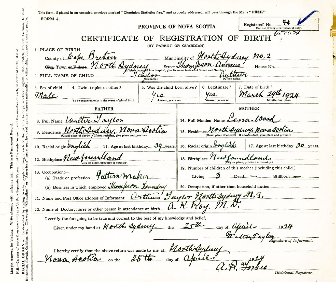 Male Birth Registration: Year: 1924 number: 65100074