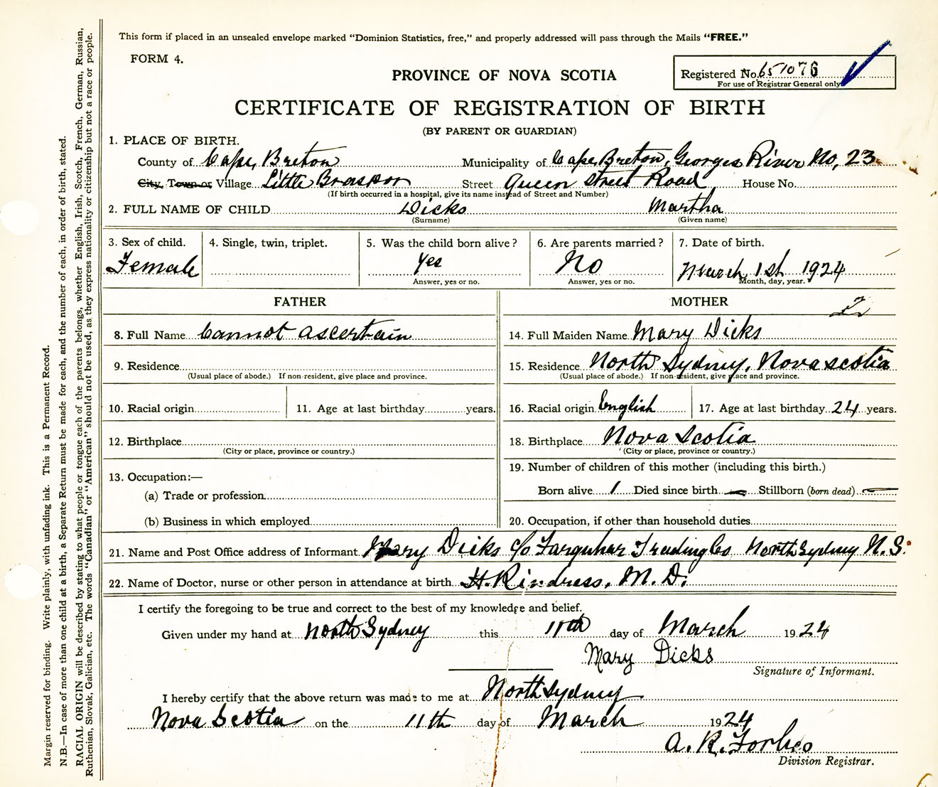 Female Birth Registration: Year: 1924 number: 65100076