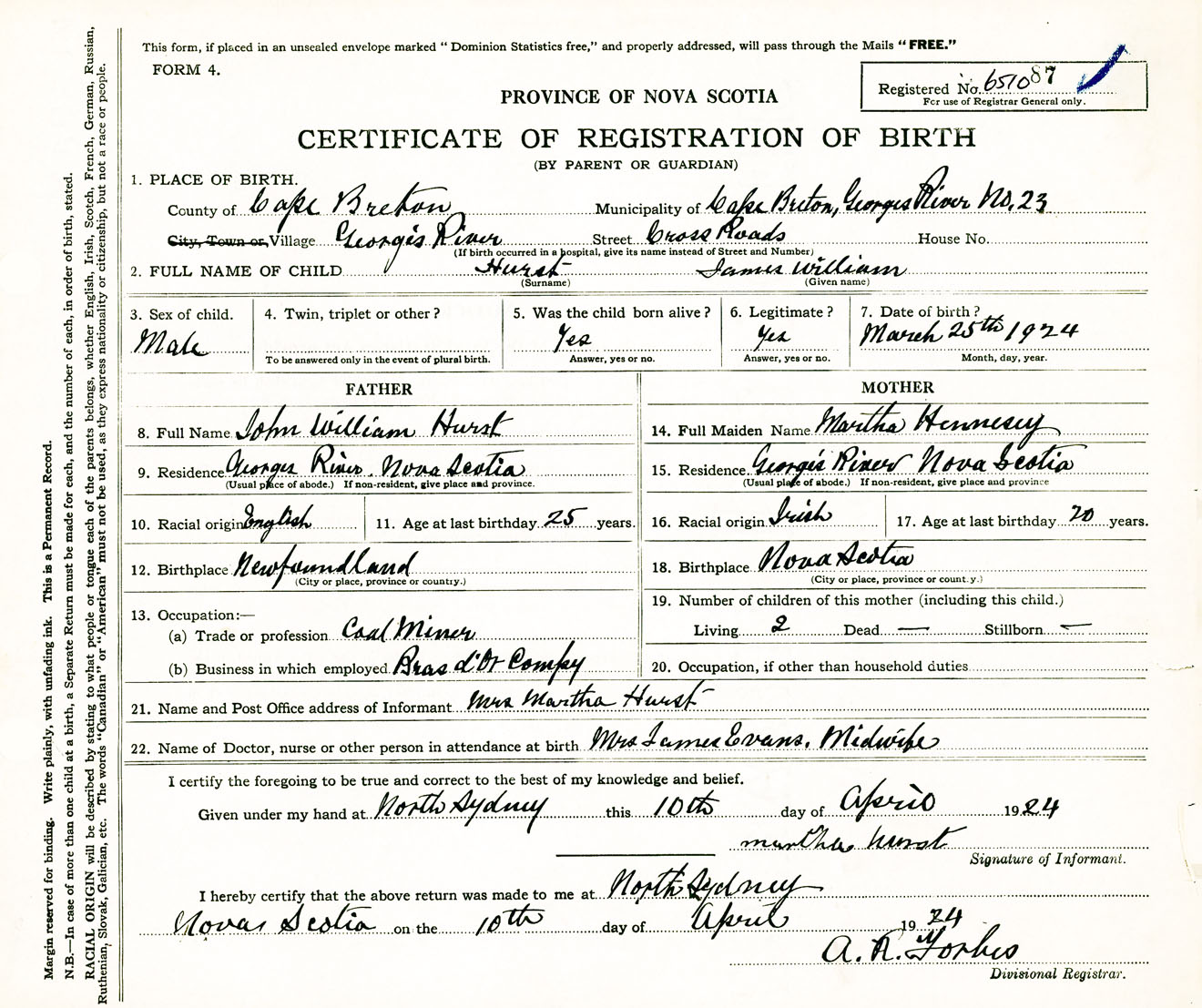 Male Birth Registration: Year: 1924 number: 65100087