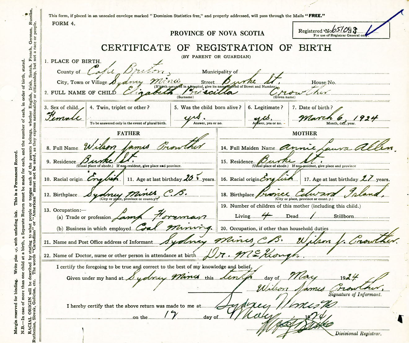 Female Birth Registration: Year: 1924 number: 65100093