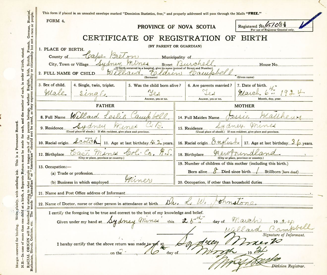Male Birth Registration: Year: 1924 number: 65100094