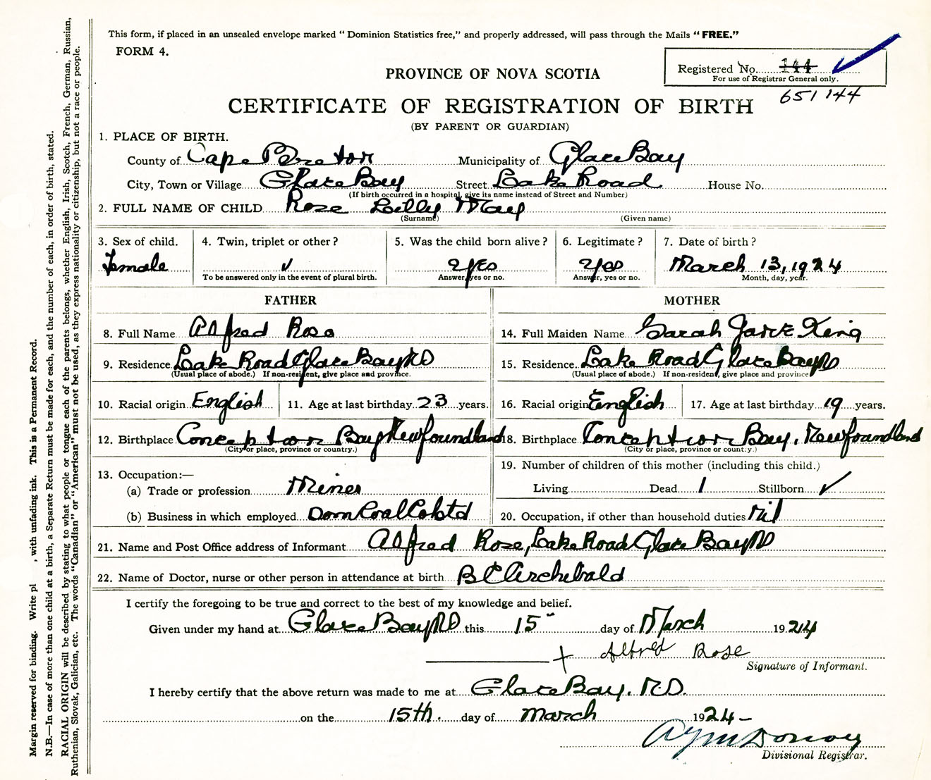Female Birth Registration: Year: 1924 number: 65100144