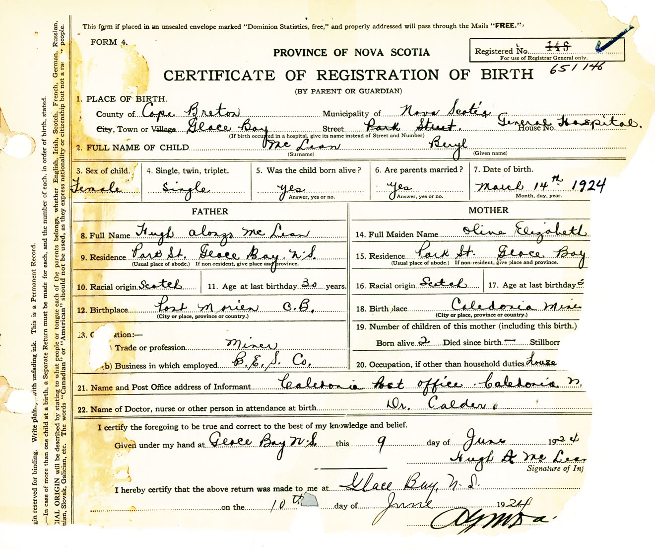 Female Birth Registration: Year: 1924 number: 65100146