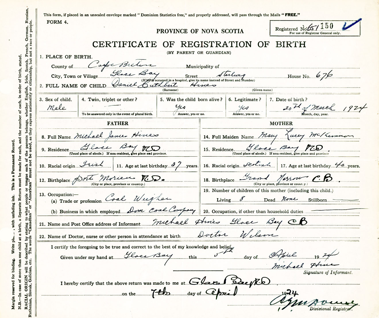 Male Birth Registration: Year: 1924 number: 65100150