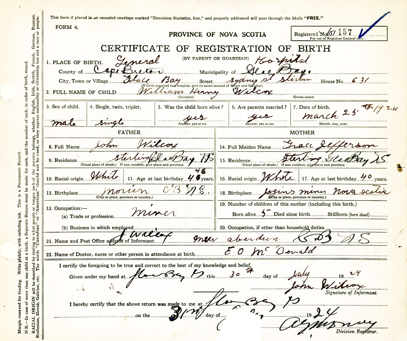 Male Birth Registration: Year: 1924 number: 65100157