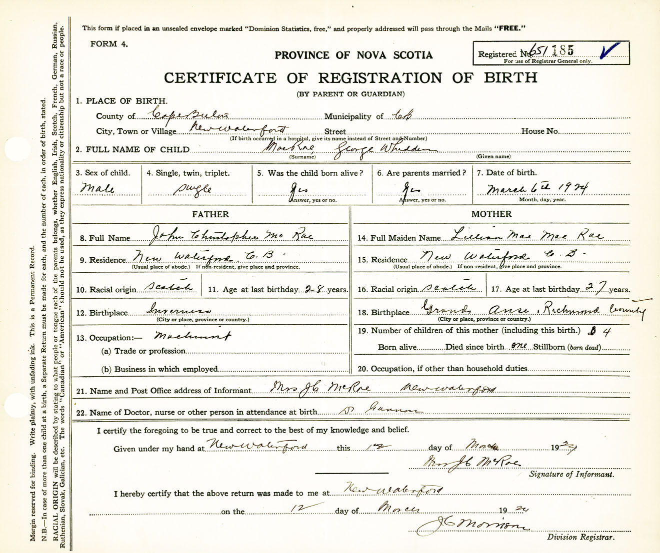 Male Birth Registration: Year: 1924 number: 65100185