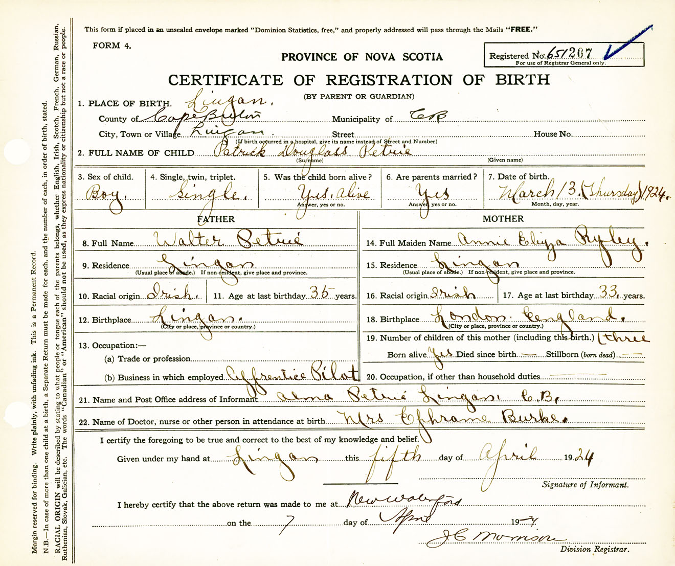 Male Birth Registration: Year: 1924 number: 65100207
