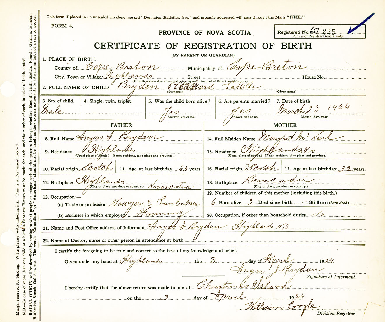 Male Birth Registration: Year: 1924 number: 65100225