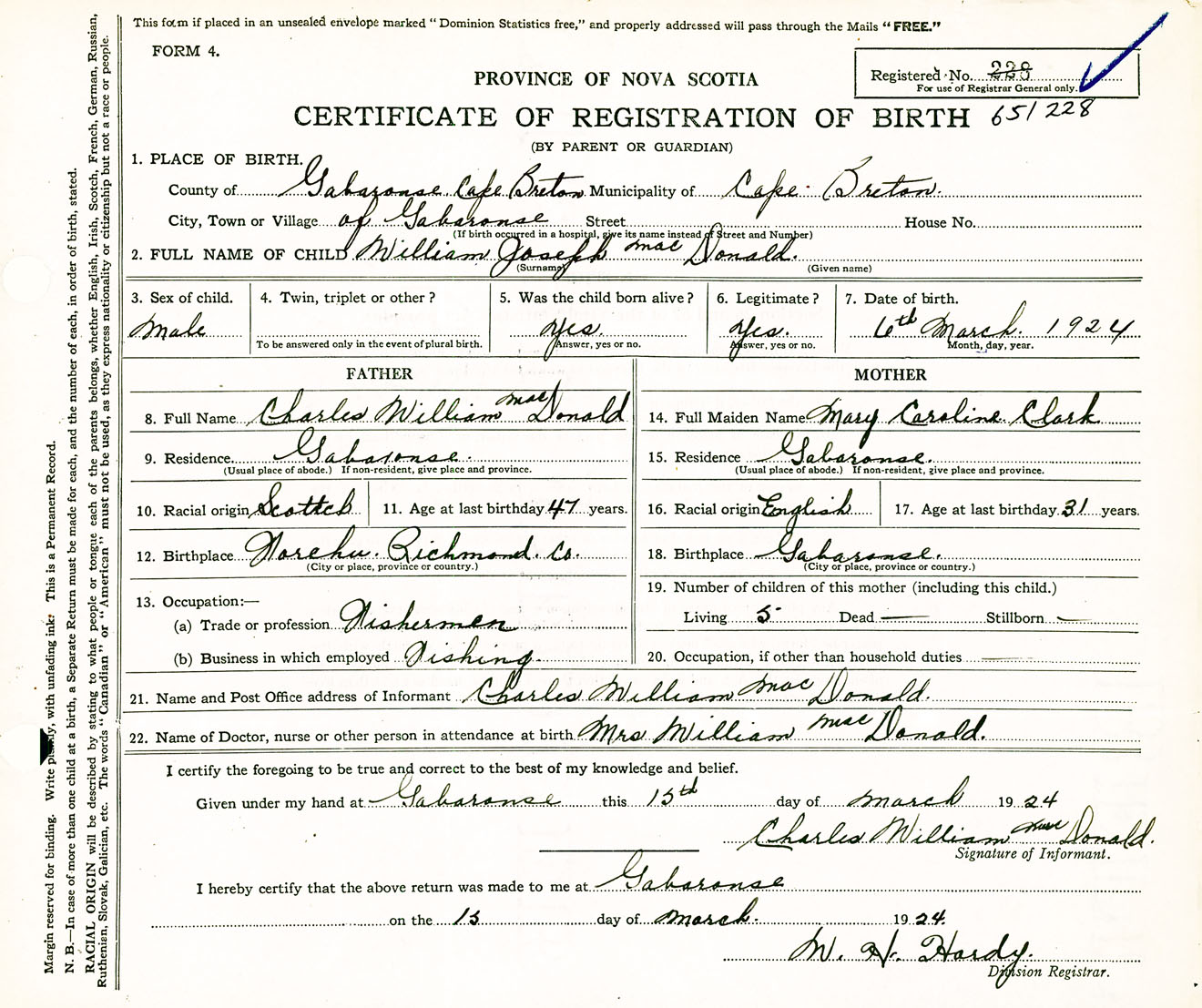 Male Birth Registration: Year: 1924 number: 65100228