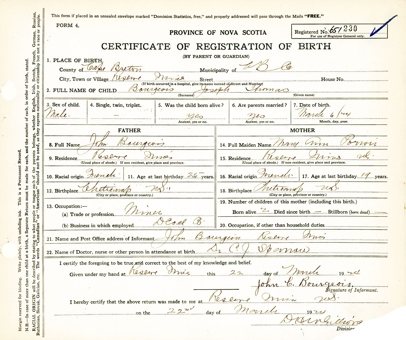 Male Birth Registration: Year: 1924 number: 65100230