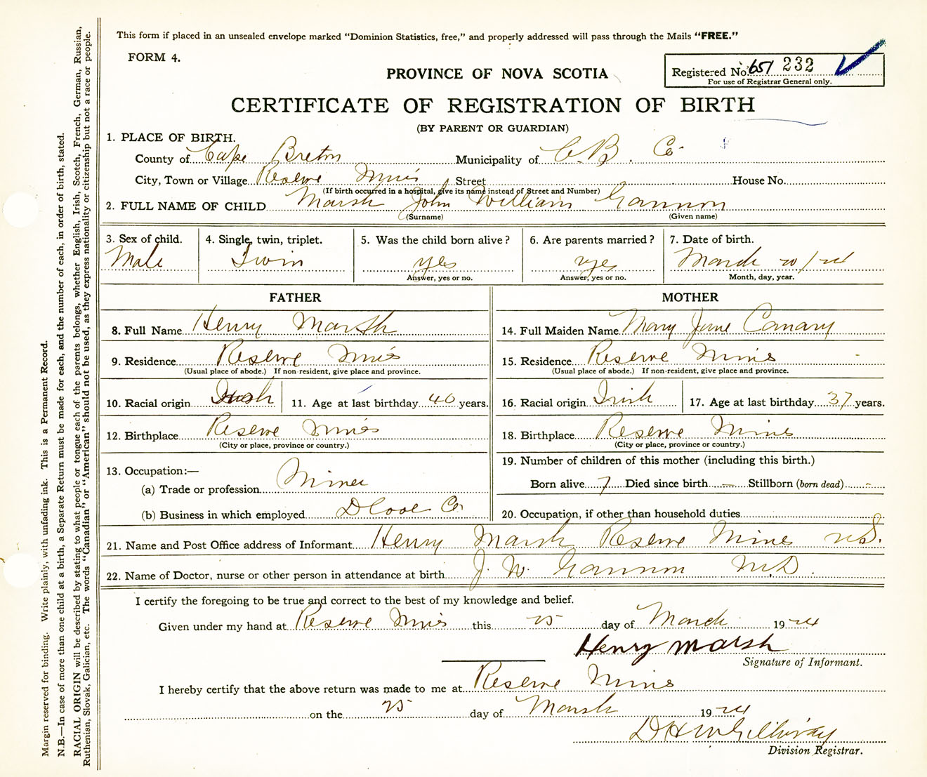 Male Birth Registration: Year: 1924 number: 65100232