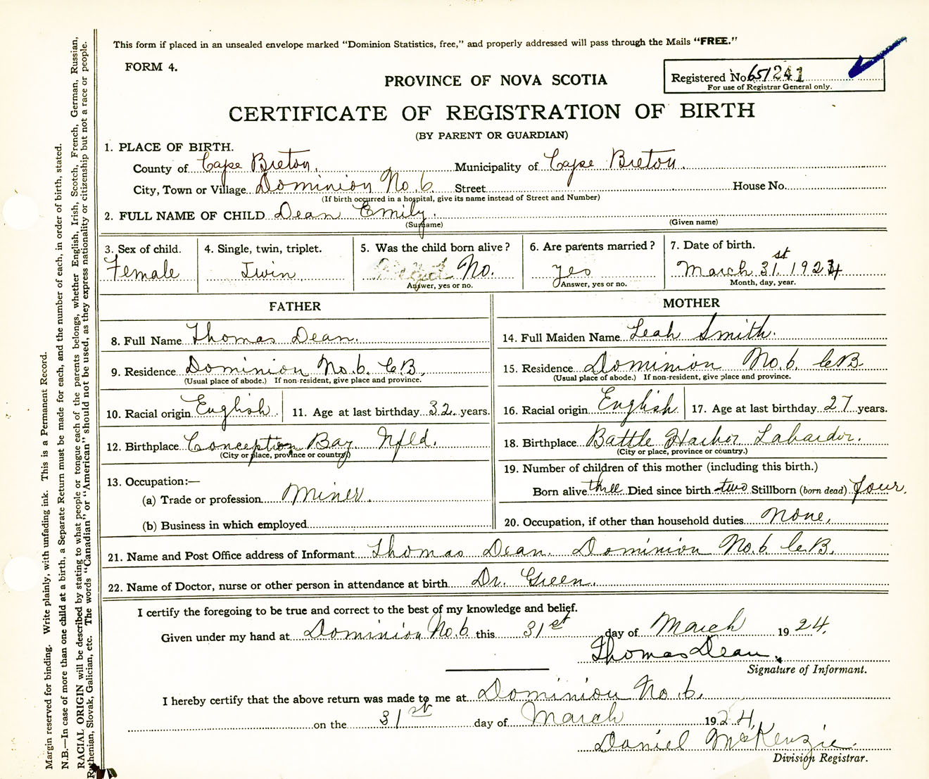 Female Birth Registration: Year: 1924 number: 65100241