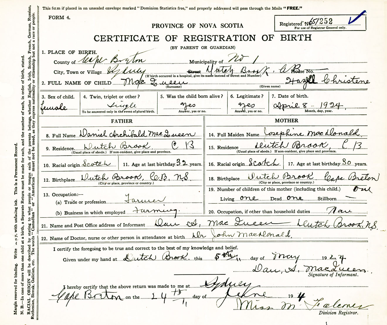 Female Birth Registration: Year: 1924 number: 65100252