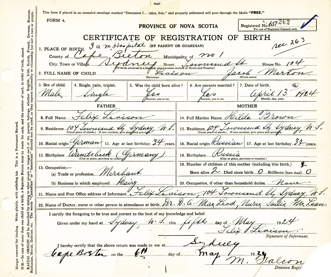 Male Birth Registration: Year: 1924 number: 65100262