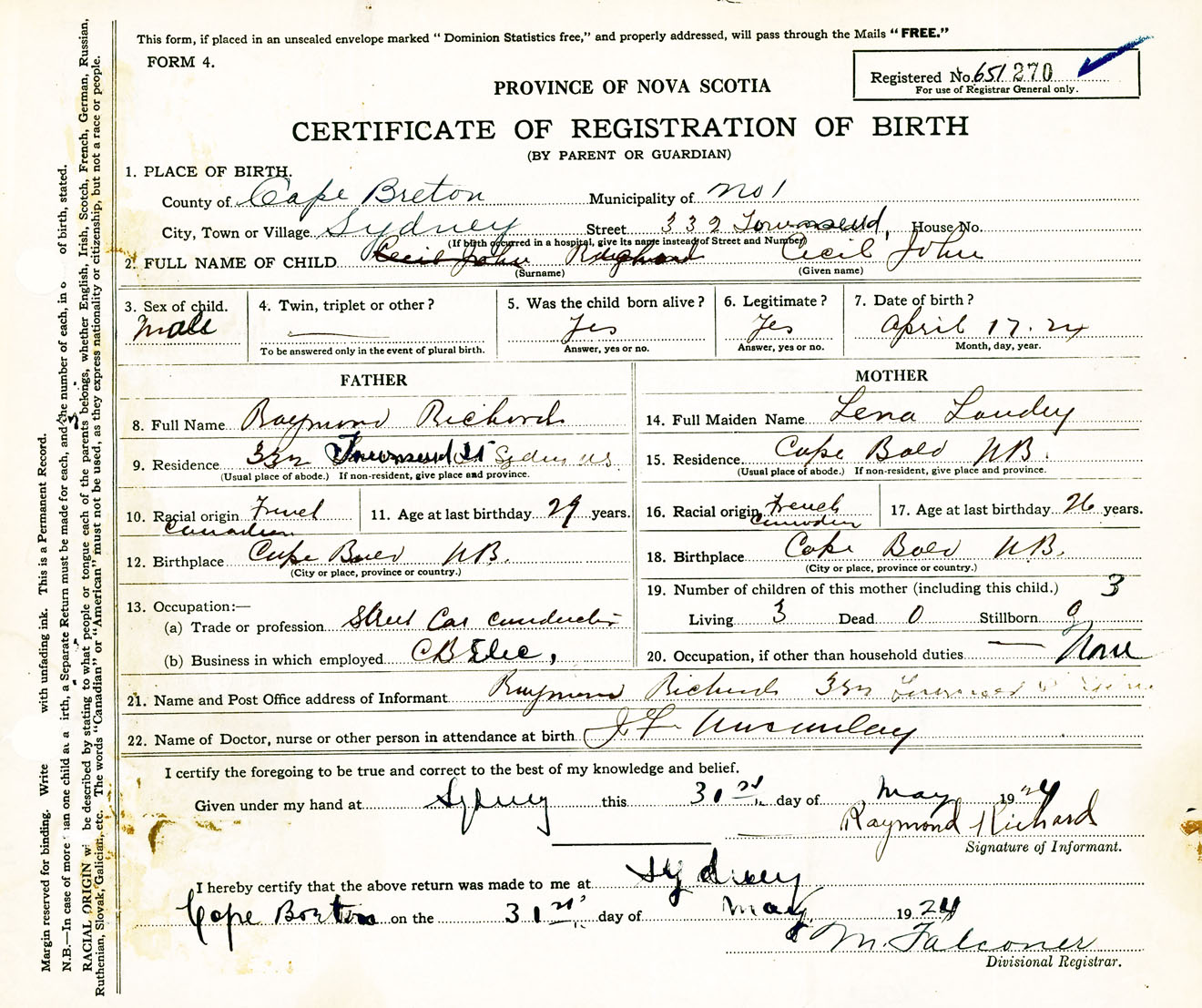 Male Birth Registration: Year: 1924 number: 65100270
