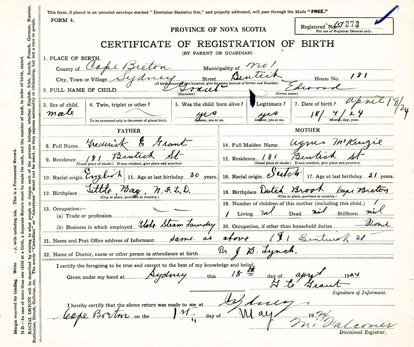 Male Birth Registration: Year: 1924 number: 65100273