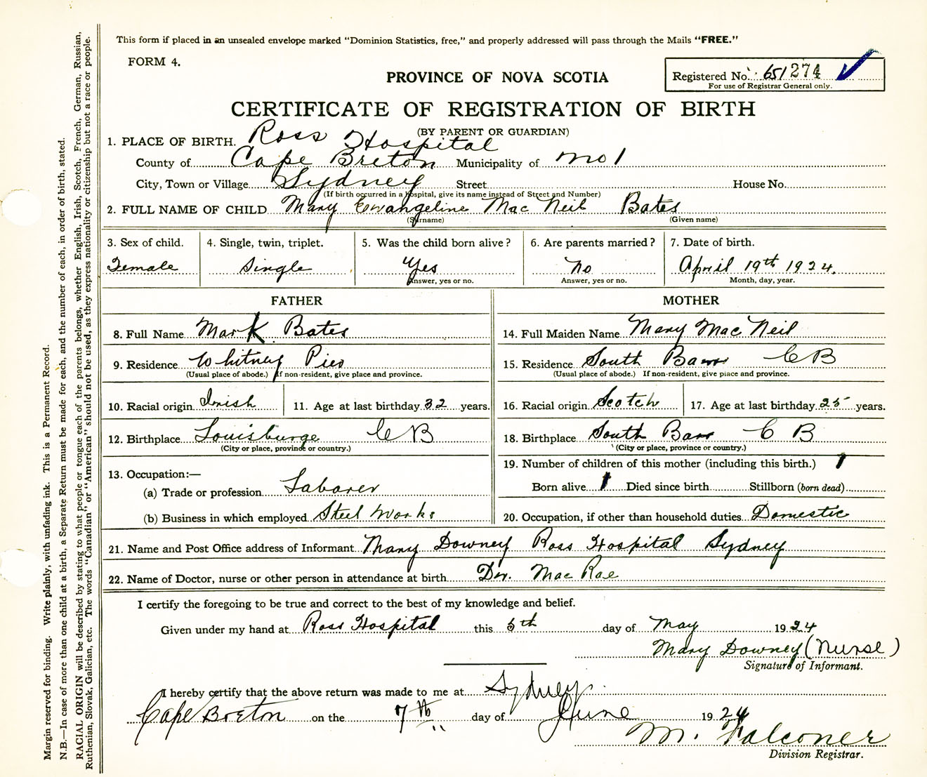 Female Birth Registration: Year: 1924 number: 65100274