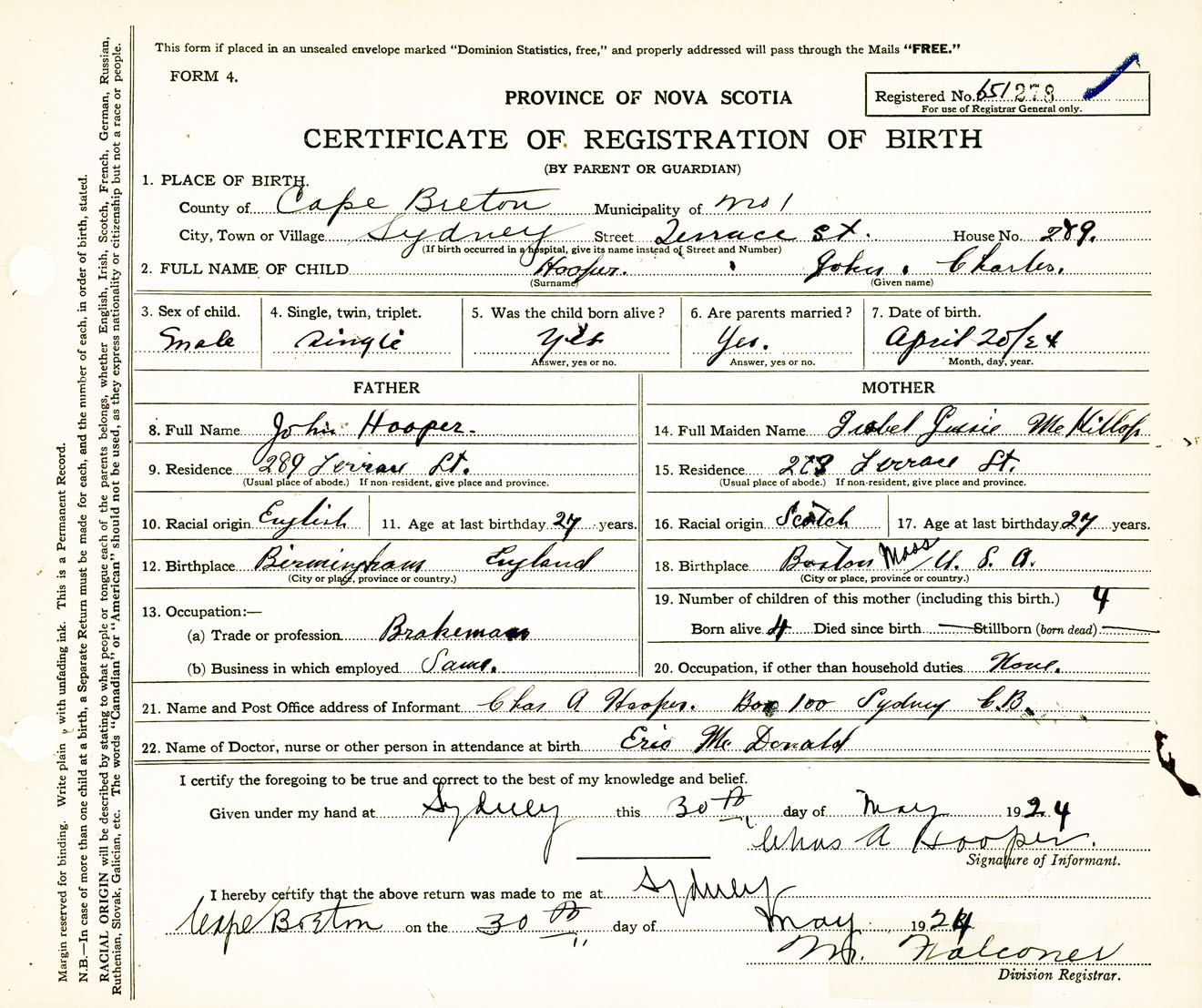 Male Birth Registration: Year: 1924 number: 65100278