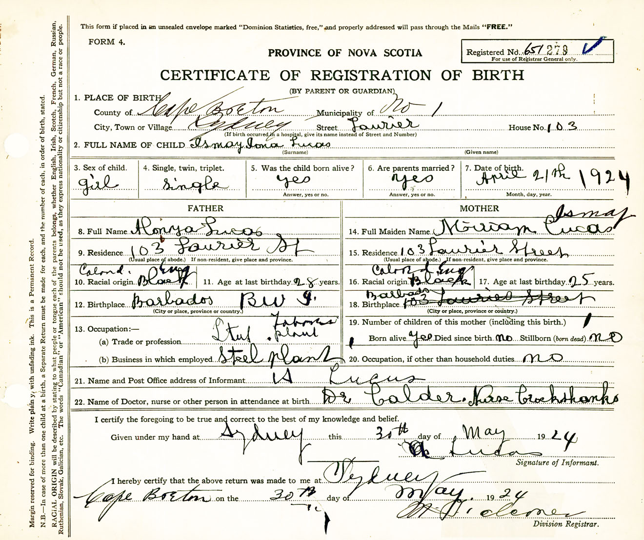 Female Birth Registration: Year: 1924 number: 65100279