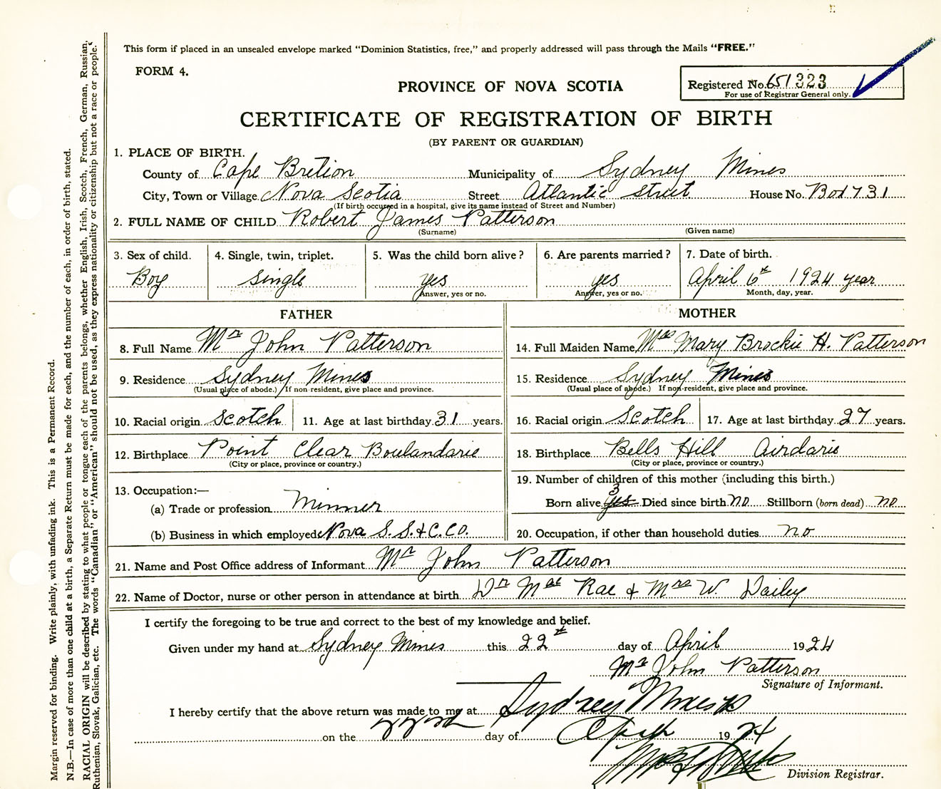 Male Birth Registration: Year: 1924 number: 65100323